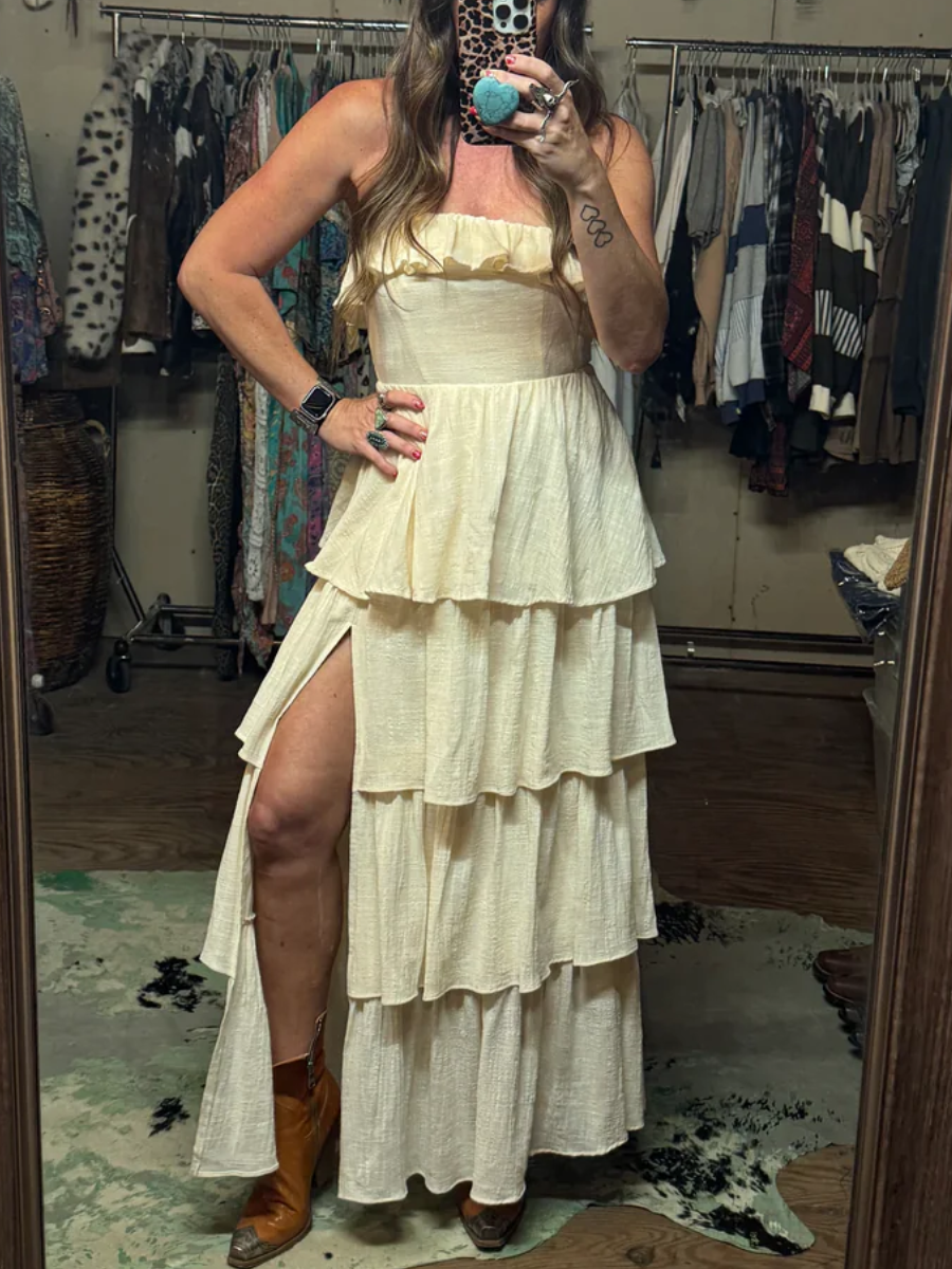 Beautiful V Neck Ruffle Slit Maxi Dress