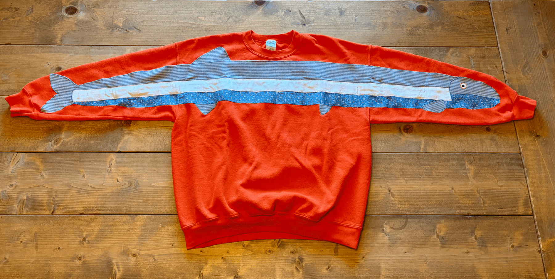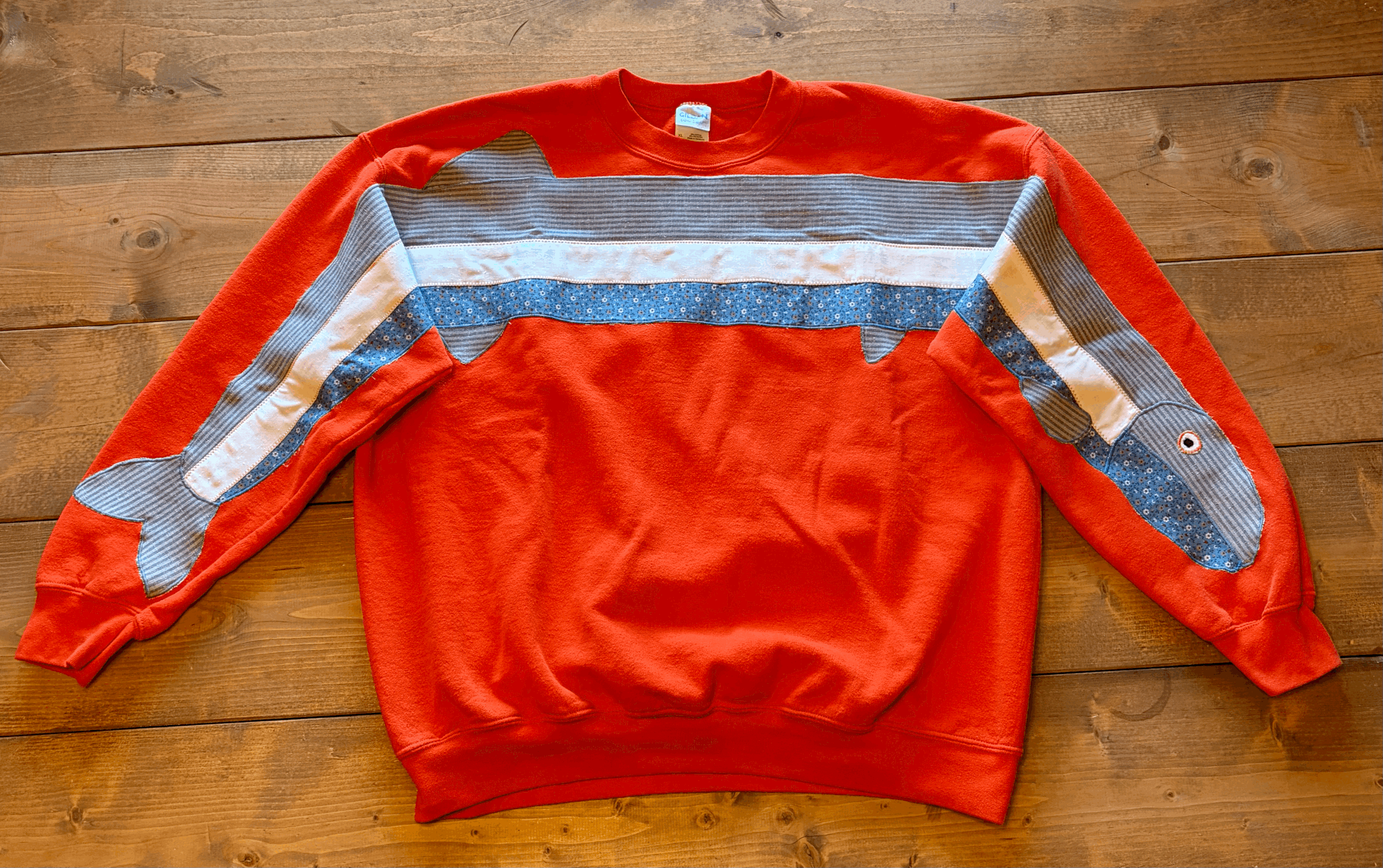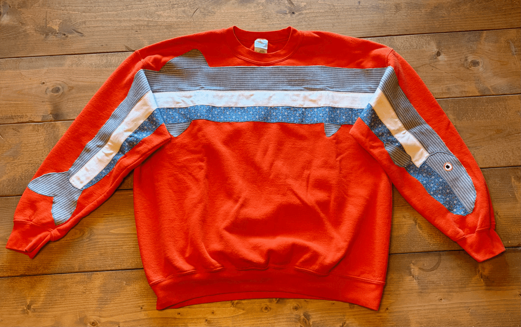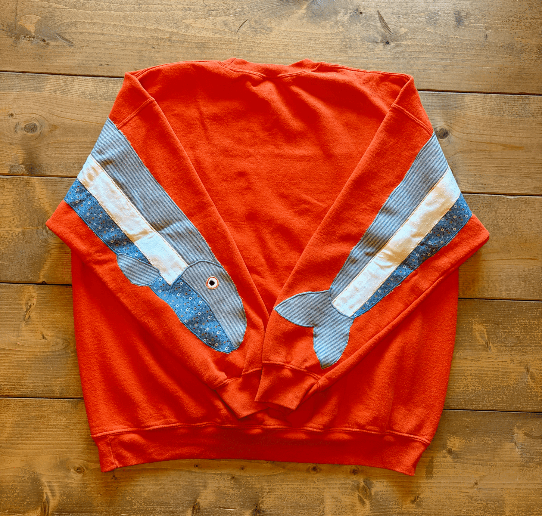 Bright orange crewneck upcycled with a long patchwork fish design across the sleeves and chest. Fish is made with recycled fabric scraps and secured to the garment with interfacing and zigzag stitching around borders. All materials are second-hand, promoting sustainable and zero-waste production.