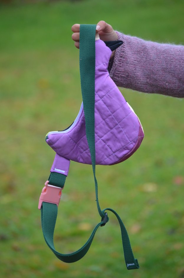 The Fly Away Crossbody is a sling bag shaped like a bird! This is a completely handmade bird bag that will quickly become your go-to crossbody. Besides the adorable bird front, it has a mosaic of colorful fabric and notions for the interior, strap, zipper, and back side. The bag can be worn like a sling or a shoulder bag, and the strap is fully adjustable. Gorgeously soft quilted bag made from 100% cotton fabric and batting 100% cotton strap with high-quality plastic buckles and zipper Fully-lined interior Bag faces the right side of the body while you’re wearing it. It features a front designed to resemble a patterned duck, with black, mauve, peach, green, and blue coloring. The bag interior pictured here is just an example; the interior colors of each bag vary. Hand-wash with water and gentle soap only.