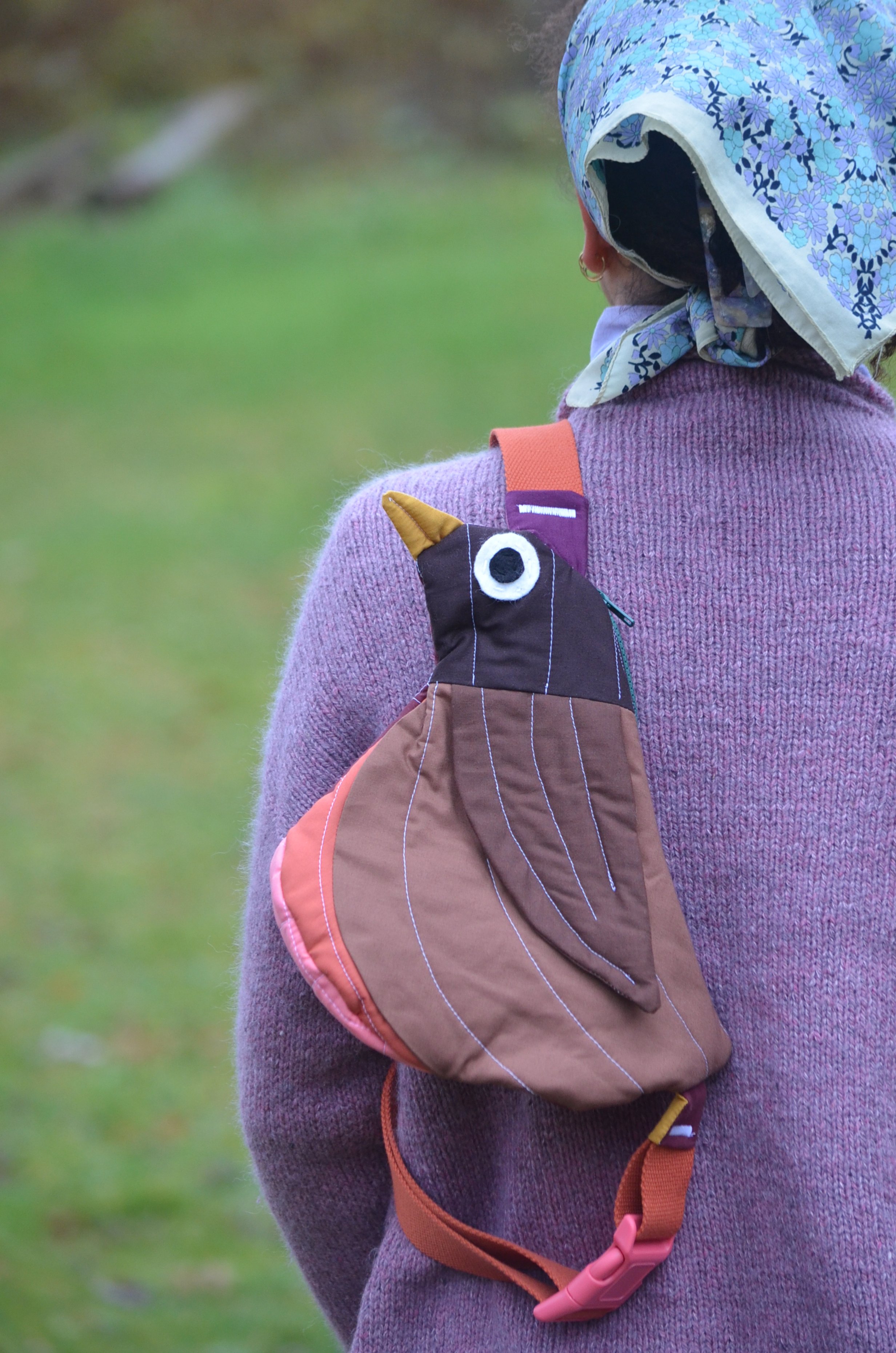 The Fly Away Crossbody is a sling bag shaped like a bird! This is a completely handmade bird bag that will quickly become your go-to crossbody. Besides the adorable bird front, it has a mosaic of colorful fabric and notions for the interior, strap, zipper, and back side. The bag can be worn like a sling or a shoulder bag, and the strap is fully adjustable. Gorgeously soft quilted bag made from 100% cotton fabric and batting 100% cotton strap with high-quality plastic buckles and zipper Fully-lined interior Bag faces the right side of the body while you’re wearing it. It features a front designed to resemble a Robin, with brown and red coloring. The bag interior pictured here is just an example; the interior colors of each bag vary. Hand-wash with water and gentle soap only.