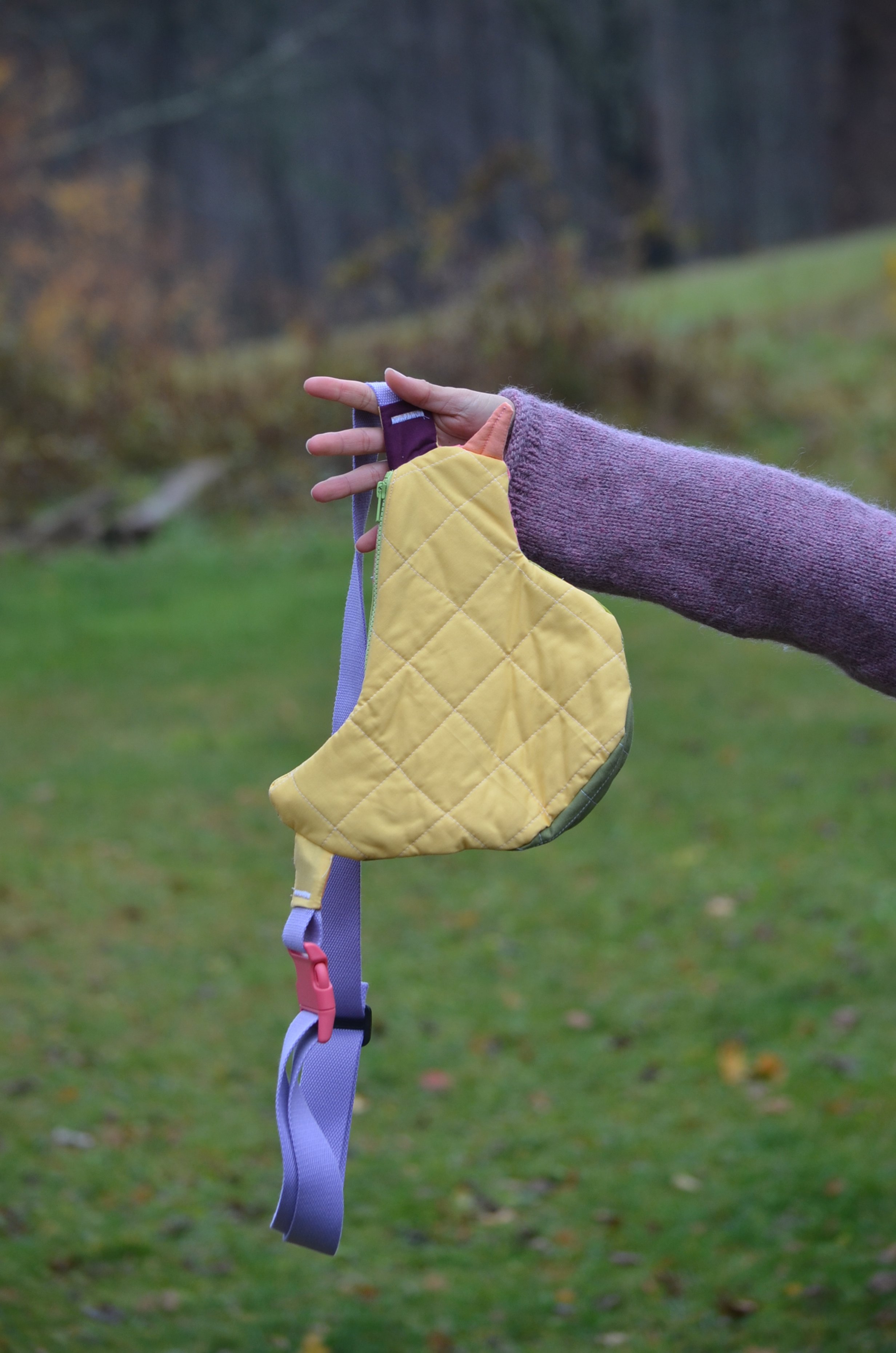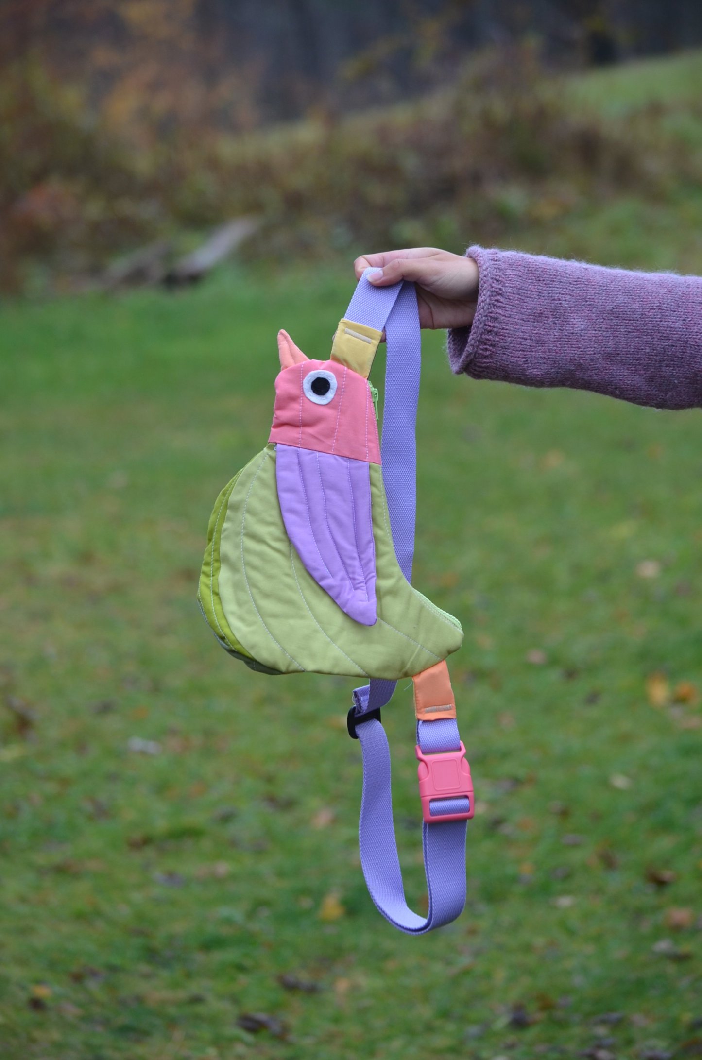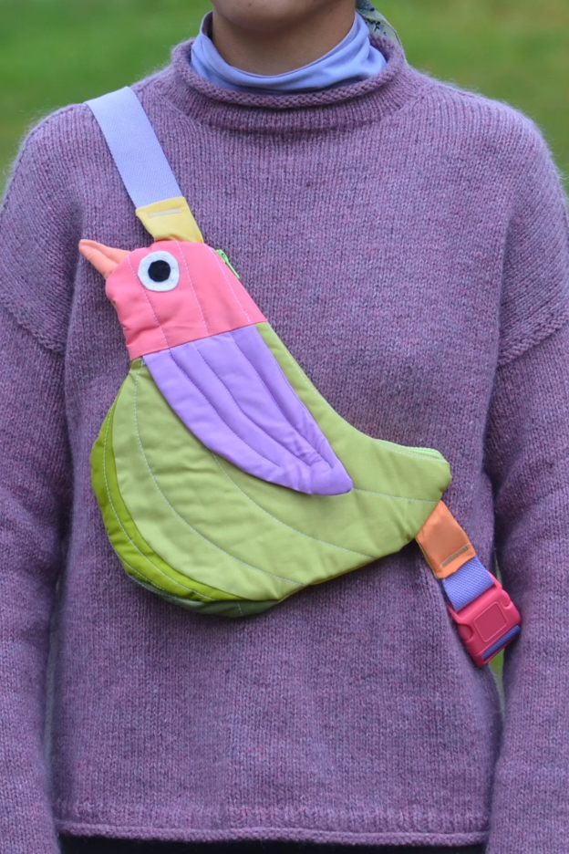 The Fly Away Crossbody is a sling bag shaped like a bird! This is a completely handmade bird bag that will quickly become your go-to crossbody. Besides the adorable bird front, it has a mosaic of colorful fabric and notions for the interior, strap, zipper, and back side. The bag can be worn like a sling or a shoulder bag, and the strap is fully adjustable. Gorgeously soft quilted bag made from 100% cotton fabric and batting 100% cotton strap with high-quality plastic buckles and zipper Fully-lined interior Bag faces the right side of the body while you’re wearing it. It features a songbird front with pink, green, and purple coloring. The bag interior pictured here is just an example; the interior colors of each bag vary. Hand-wash with water and gentle soap only.