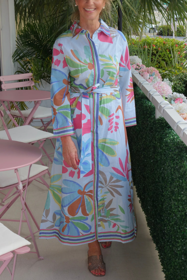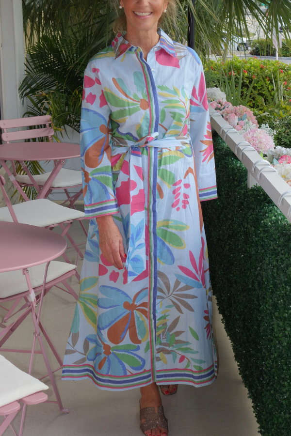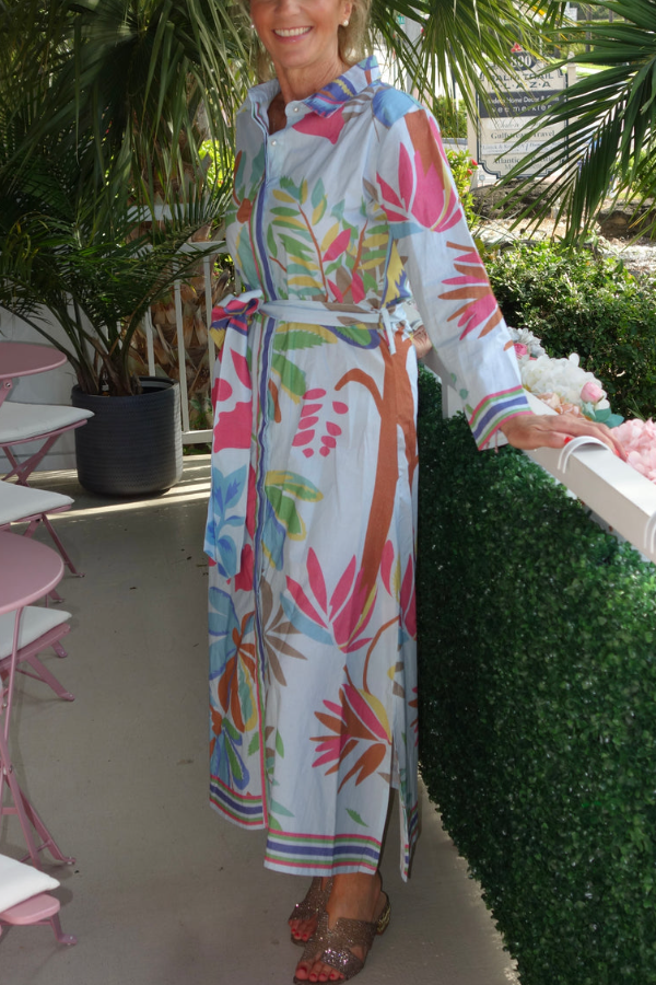 Details The classic lapel and long sleeves exude a sophisticated and capable air, softening the complexity of the print and creating a more streamlined overall look. The long sleeves can be rolled up to suit different temperatures and styles. The full button-down front allows for adjustable neckline opening, creating a polished professional look or a relaxed, vacation vibe with a few buttons undone, while also being easy to put on and take off. The bold, abstract tropical plant pattern, with its bright colors and free-flowing brushstrokes, evokes the Caribbean and South Florida resort feel, creating a strong visual impact and instantly drawing attention.