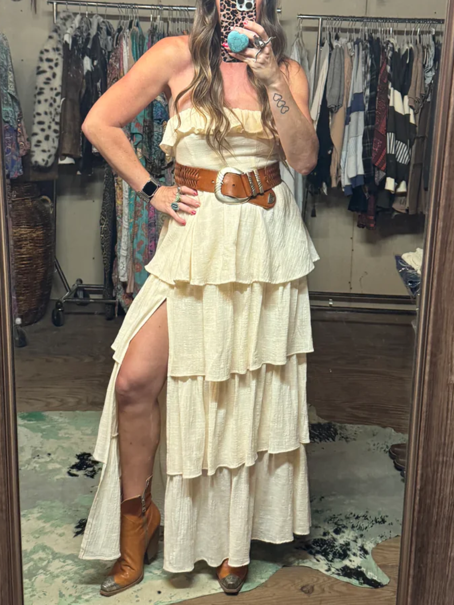 The Santorini dress is the perfect blend of elegance and comfort. Featuring a strapless ruffle design and elastic across the back, it provides a flattering fit for any body type. The high slit in the front adds a touch of glamour, making it ideal for special occasions such as wedding receptions or baby showers.