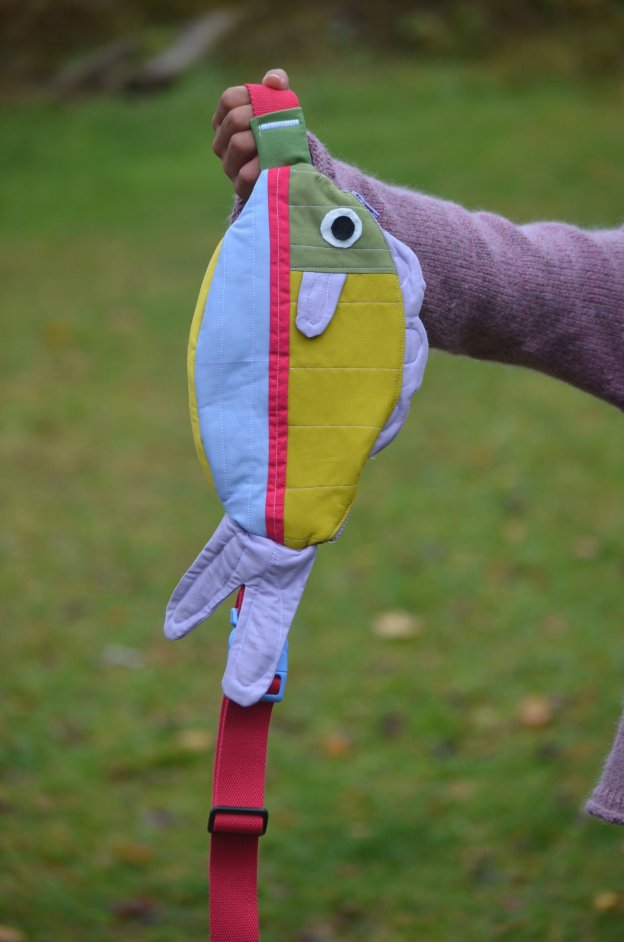 The Swim Along Crossbody is a sling bag shaped like a friendly fish! This is a completely handmade fish bag that will quickly become your go-to crossbody. Besides the adorable fish front, it has a mosaic of colorful fabric and notions for the interior, strap, zipper, and back side. The bag can be worn like a sling, a shoulder bag, or a fanny pack, and the strap is fully adjustable. Gorgeously soft quilted bag made from 100% cotton fabric and batting 100% cotton strap with high-quality plastic buckles and zipper Fully-lined interior Bag faces the right side of the body while you’re wearing it. It features a green, pink, and blue body. The fins are lavender, and the strap is pink. The bag interior pictured here is just an example; the interior colors of each bag vary. Hand-wash with water and gentle soap only.