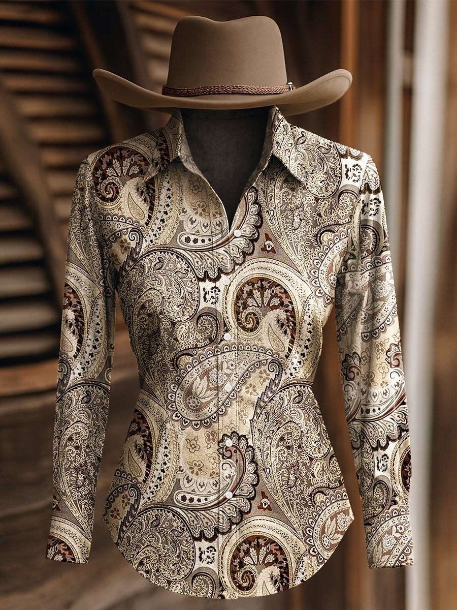 Women's Vintage Paisley Floral Print Western Long Sleeve Shirt